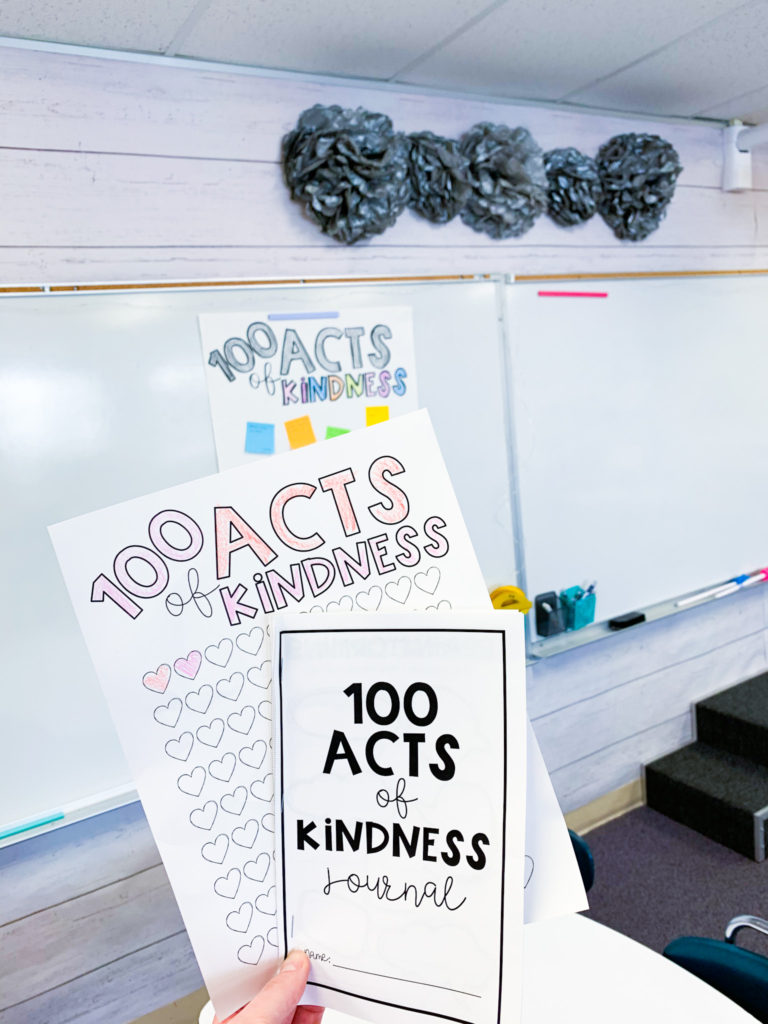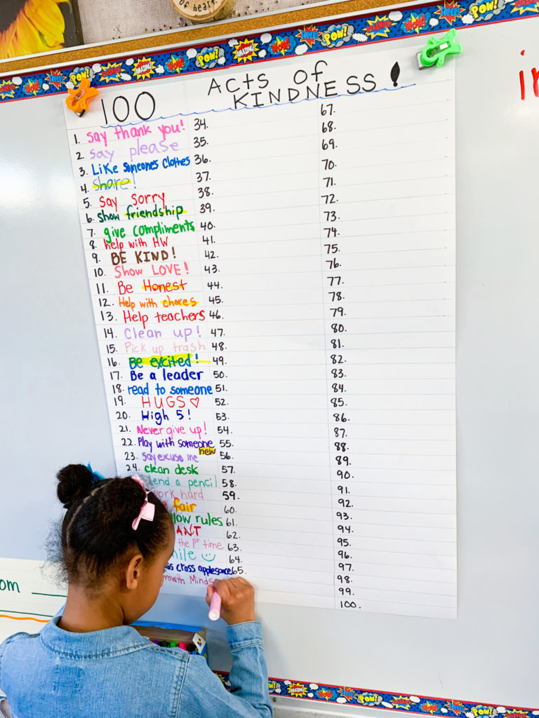 Another class favorite EVERY year with my little people is the 100 Acts of Kindness. About a week before the 100th day of school, I challenge the students to do 100 acts of kindness. These can be the simplest of things, like helping a friend up a recess, picking up trash, or inviting a new friend to play. My first graders always have the best time and our behavior that week is ALWAYS on point. You can make a simple chart to collect all the acts that students do or you can be a little more elaborate in collecting with this 100 Acts of Kindness pack (which can be used year round too).
