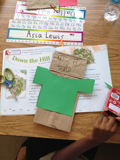 We read some cute stories and I wanted to share an idea with you. There are a few of my kids who can’t read all that well {if at all..} and this activity worked for them. After we read “Frog and Toad: Down the Hill”, I had my kids make cute little Frog/Toad puppets, some may or may not have looked like frogs…