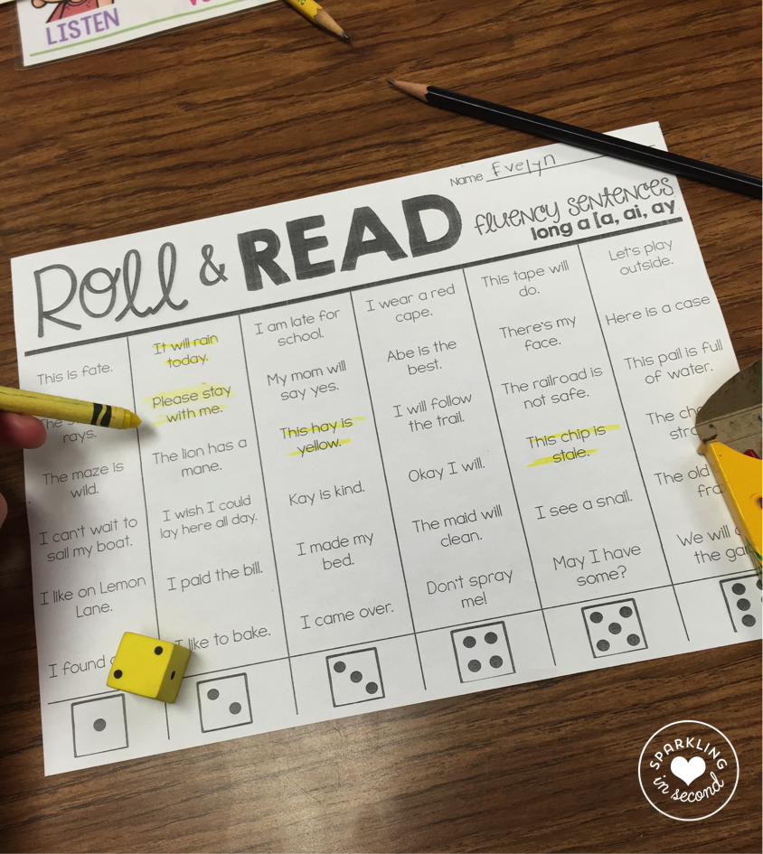 We take out our Roll & Reads, grab a crayon, grab FOAM dice {to save my sanity}, and get right to work with our partners. This is a fun way to get the students reading and recognizing sentences as well as spelling patterns. Depending on what sound/spelling pattern we are working on as a grade level, I use that particular skill. These Roll & Reads are organized by each spelling pattern.