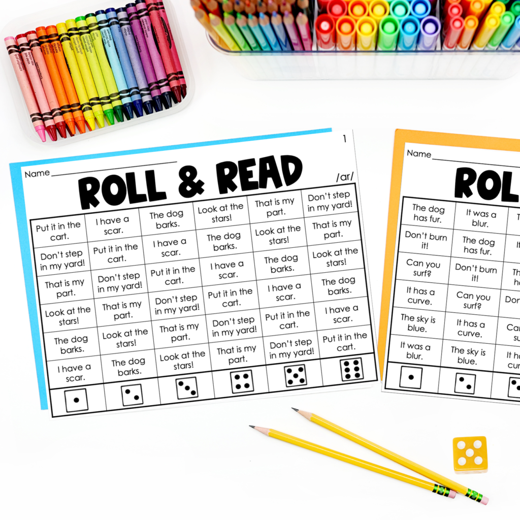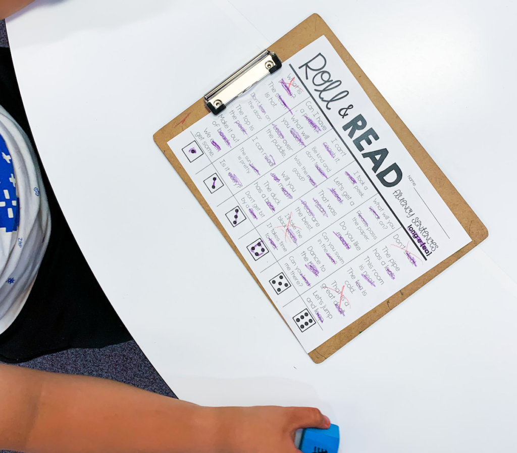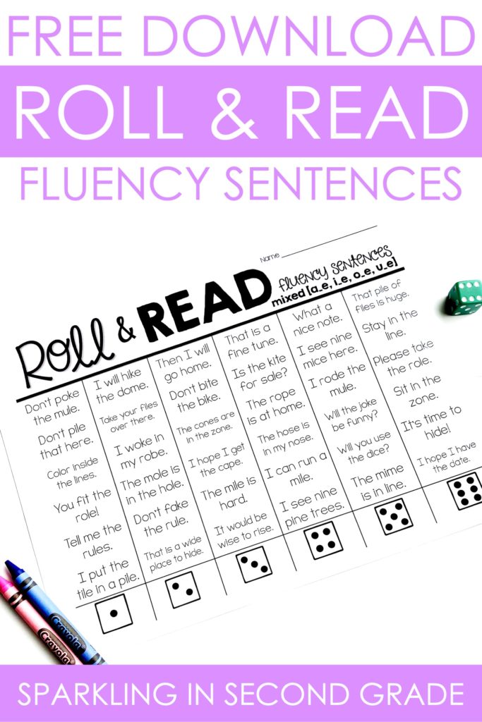 Fluency. A dreaded word at times. But here’s a super fun way to practice your phonics pattern as well as reading sentences. Grab dice (I use both these small foam dice or these large foam dice-affiliate links) roll it, pick a sentence, read it to a partner, & color it!
