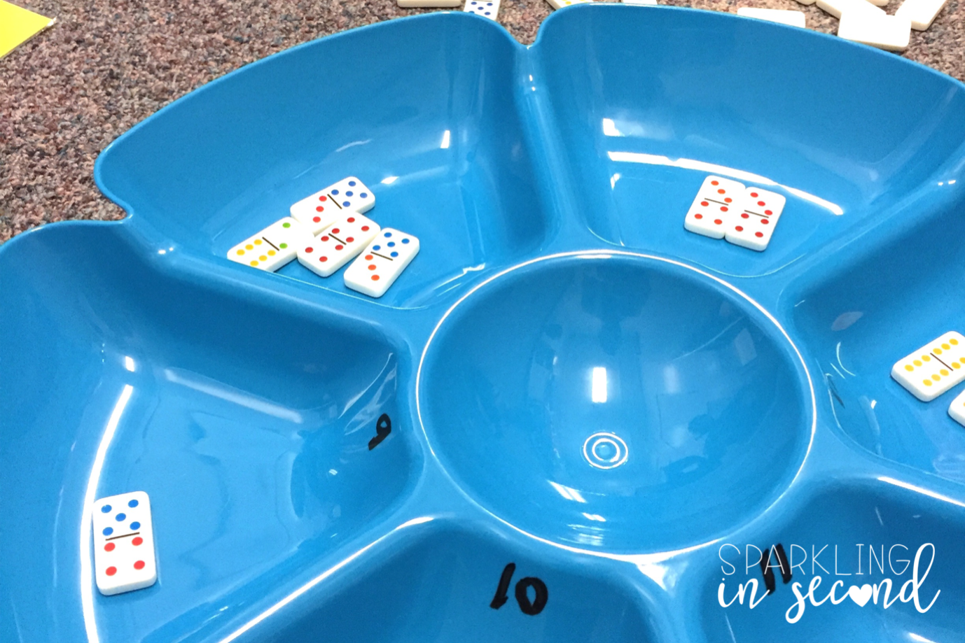 This activity is a combination of subitizing, number recognition, and addition. I put out a tray labeled with numbers 1-12 (find some chip trays here-Amazon aff link). Then I throw a bunch of dominoes out in the middle and let them sort the dominoes into the tray. I’ll randomly question a student with a domino (“How many are on this side? What about the other? How many is that all together?”). The students are adding and don’t even realize it! I give my students a 120 chart if they cannot match the numbers just yet. We use the 120’s chart to count and see what the digit looks like if needed. Find domino sets here-Amazon aff link.
