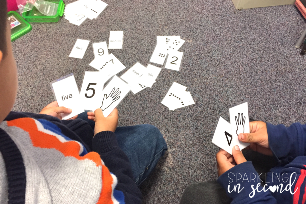 This is activity covers most of the same work that the domino sort does. It can be played as “Memory”, “Go Fish”, or simply matching. Students need to match the number cards to the word cards, finger cards, and subitizing cards. These cards will help reinforce student fluency with number recognition and internalize it for the basis of addition. I can’t find the originals, but made a set here for you for free!